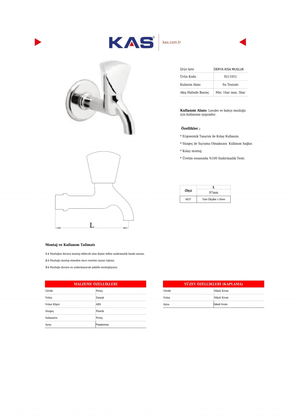 Kas 9211051 Derya Kısa Musluk, kompakt tasarımı ve dayanıklı yapısıyla dar alanlarda pratik kullanım sunar. Duvara montajlı kısa çıkışlı formu sayesinde lavabo, evye ve yardımcı kullanım alanları için ideal bir çözümdür.