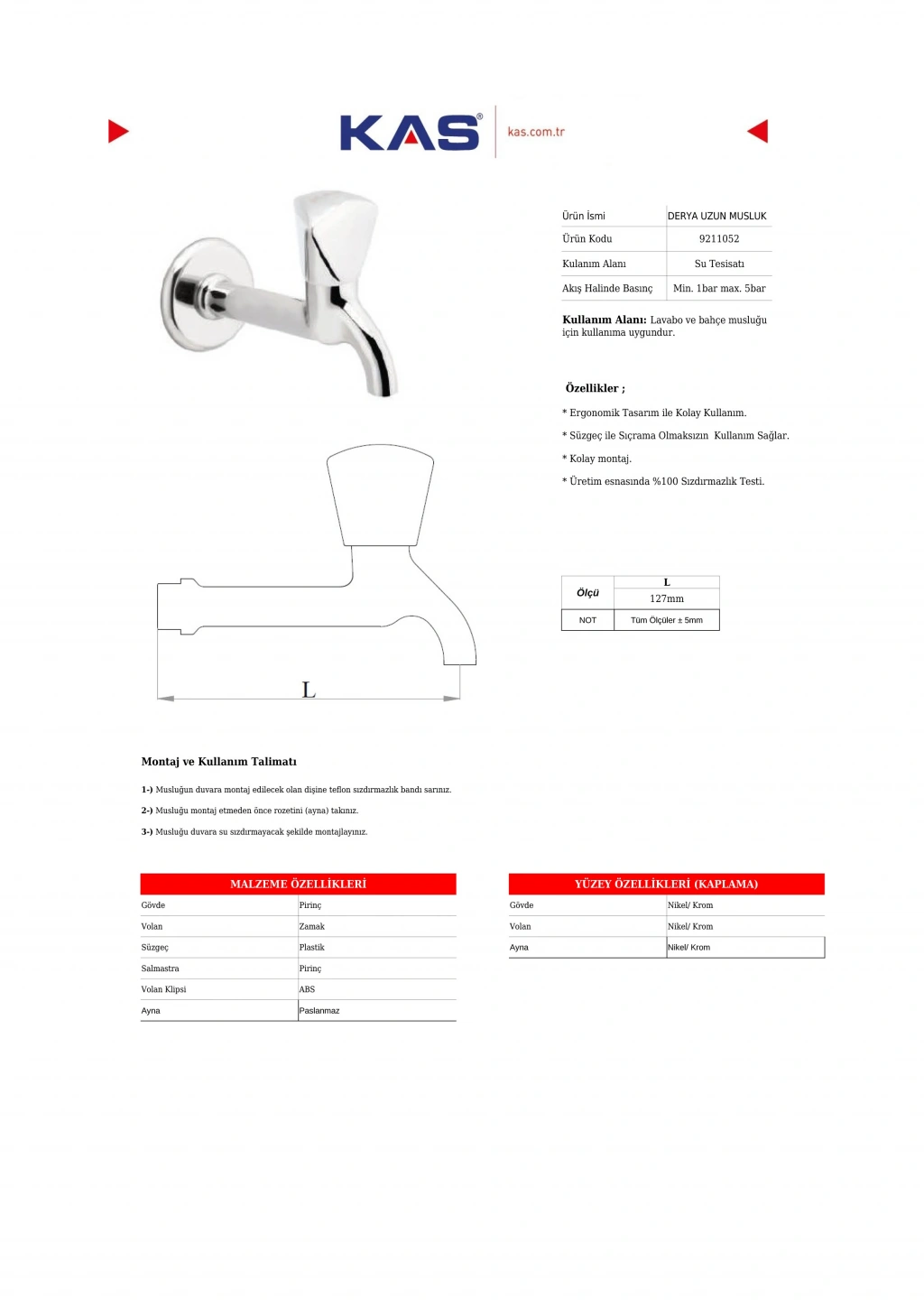 Kas 9211052 Derya Uzun Musluk, uzun çıkışlı tasarımı sayesinde geniş kullanım alanı sunan, pratik ve dayanıklı bir musluk modelidir. Duvara montajlı yapısı, lavabo ve evyelerde rahat kullanım sağlarken suya erişimi kolaylaştırır.