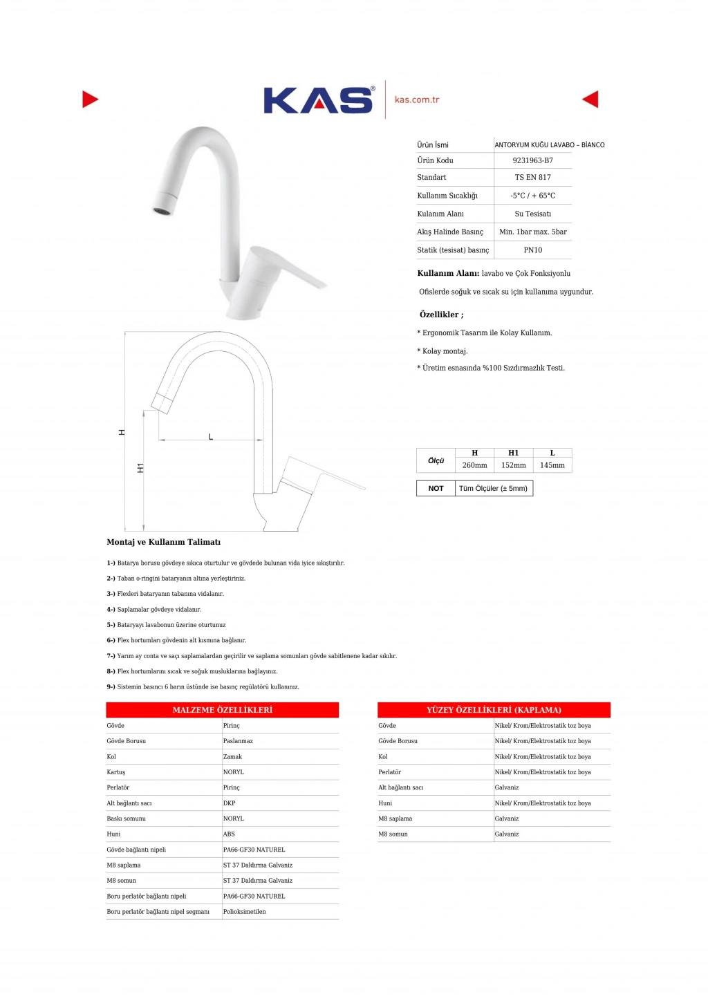 Dayanıklı gövde yapısı, neme ve korozyona karşı yüksek direnç gösterirken kolay temizlenebilir yüzeyi uzun süre hijyenik kalmasına yardımcı olur. Hem günlük ev kullanımı hem de otel, rezidans ve ticari banyolar için ideal bir tercihtir.