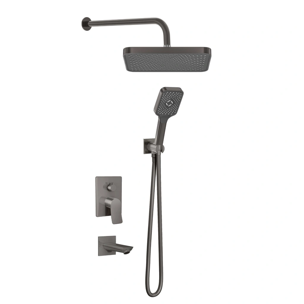 Set içerisinde yer alan 3 yollu kare Art Gray pirinç ankastre batarya, el duşu, tepe duşu ve su çıkış ucu arasında rahat ve kontrollü geçiş imkânı sağlar. 100x130 mm ölçülerinde 3 fonksiyonlu Art Gray el duşu (VS-9006) ile 300x200 mm Art Gray tepe duşu (VS-9491), farklı duş ihtiyaçlarına uygun dengeli ve konforlu bir su akışı sunar.