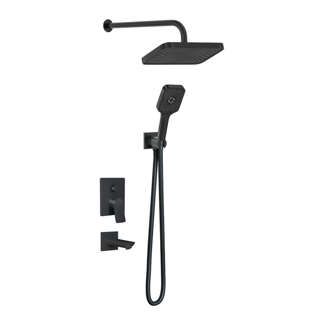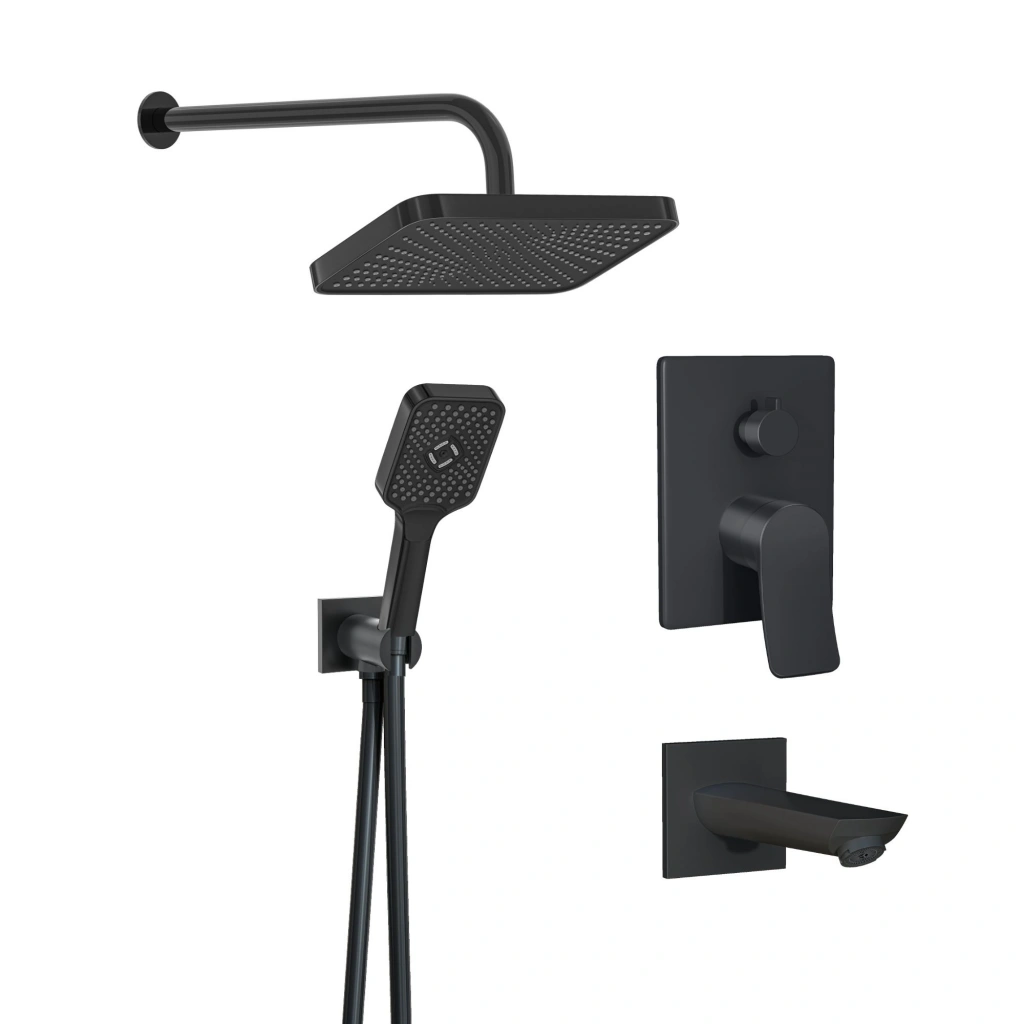 Set içerisinde yer alan 3 yollu kare mat siyah pirinç ankastre batarya, el duşu, tepe duşu ve su çıkış ucu arasında rahat ve kontrollü geçiş imkânı sağlar. 100x130 mm ölçülerinde 3 fonksiyonlu mat siyah el duşu (VS-9012) ve 300x200 mm mat siyah tepe duşu (VS-9981), farklı duş ihtiyaçlarına uygun dengeli ve konforlu bir su akışı sunar.