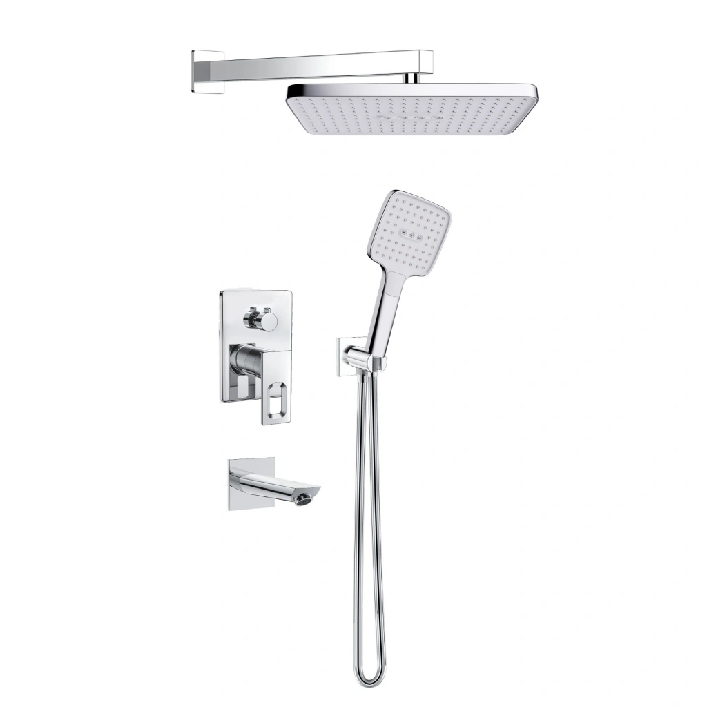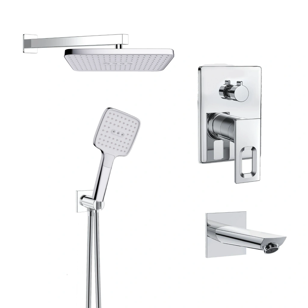 Set içerisinde yer alan 3 yollu kare krom pirinç batarya, el duşu, tepe duşu ve su çıkış ucu arasında kolay ve kontrollü geçiş sağlar. 115x115 mm ölçülerindeki 3 fonksiyonlu krom el duşu (VS-9001) ve 190x340 mm krom tepe duşu (VS-9985), farklı duş deneyimlerine uyum sağlayarak maksimum konfor sunar.